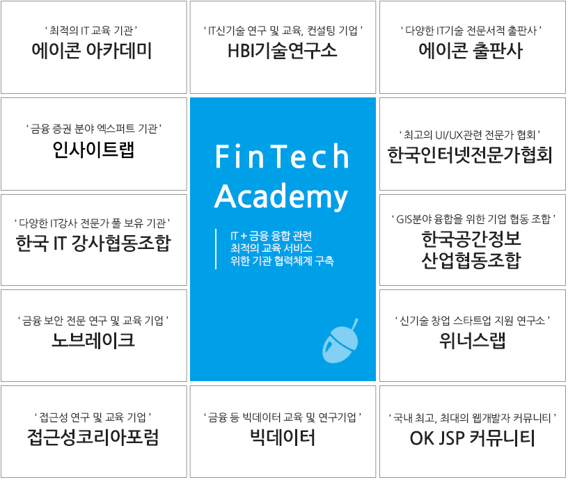 이에 본 에이콘 핀테크 아카데미는 다양한 협력 인프라를 통해 천편일률적이고 이론적인 교육이 아닌 산업현장의 사례와 실제 적용 가능한 기술을 교육하는 실무형 교육방식을 지향합니다.